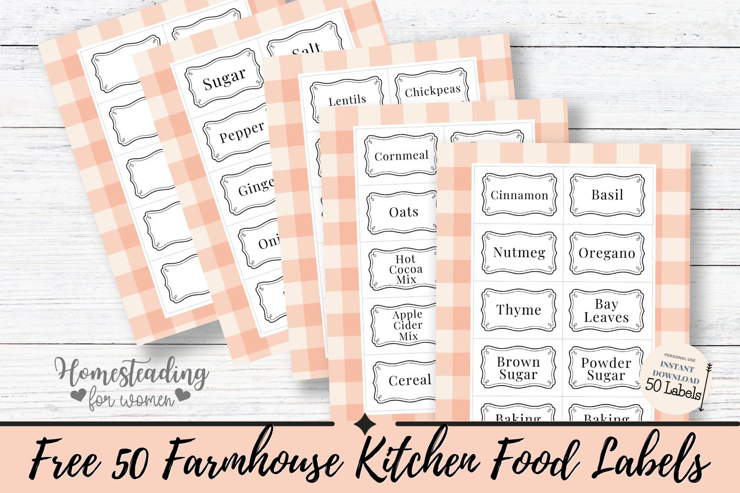 This free printable set includes 50 farmhouse-style pantry labels, including 10 blank ones you can fill in yourself.